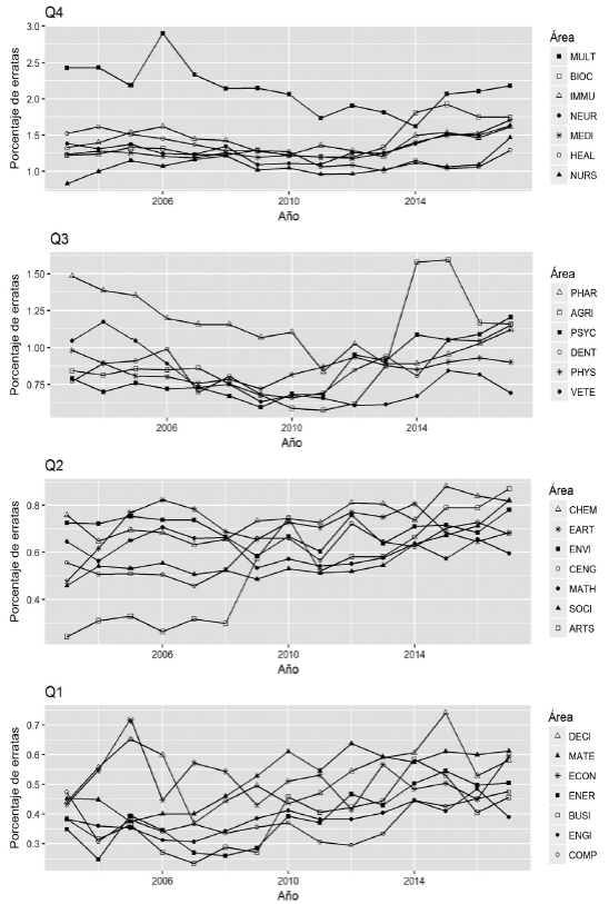 Gráfica 1 Evolución temporal del porcentaje de erratas en cada área por año, en el periodo 2003-2017. Las áreas se dividen en cuartiles del porcentaje promedio de erratas del periodo y siguen un orden decreciente.
