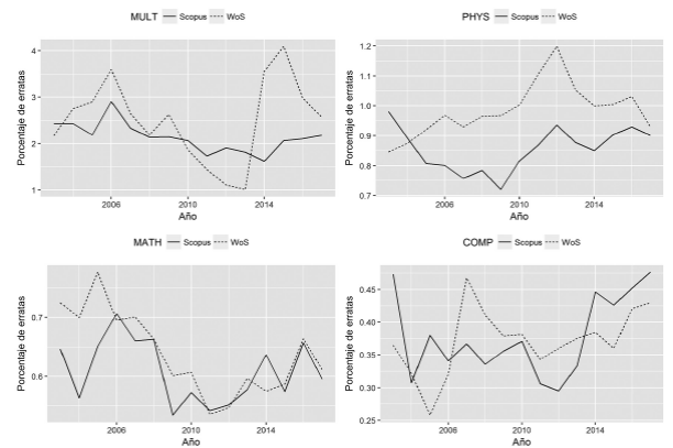 Tomando en cuenta que las áreas no son definidas exactamente de la misma manera en las dos bases de datos y que las diferencias son esperadas, las tendencias cualitativas son muy parecidas entre las dos bases de datos. La diferencia más grande se ve en MULT, entre los años 2014 y 2016, donde en WoS hay prácticamente el doble de erratas que en Scopus. La razón es que en 2014 se empezaron a contabilizar las erratas de la revista PLOS ONE en WoS, mientras que en Scopus esta revista no está en la categoría MULT y el 65 por ciento de las erratas emitidas por PLOS ONE y registradas en WoS fueron en 2014 y 2015. Una vez entendido el origen de esa diferencia, la comparación entre Scopus y WoS nos da confianza sobre los patrones observados en los datos del Cuadro 1, esto es, que no son un artefacto de la base de datos elegida.