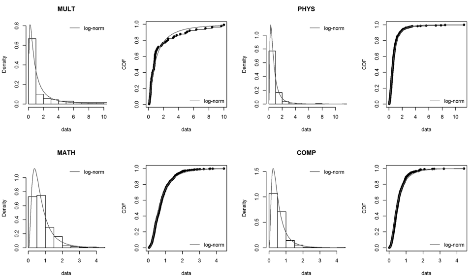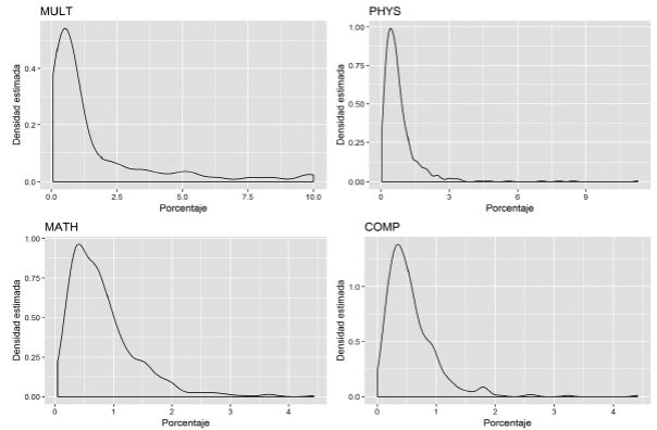 Para analizar la distribución, seleccionamos revistas con al menos una errata y calculamos el porcentaje de erratas respecto del número de artículos. Luego, seleccionamos un subconjunto de revistas con al menos cien publi caciones en el periodo. Esto para evitar valores atípicos ingenuos, es decir, revistas con un porcentaje alto de erratas, debido a un número muy pequeño de publicaciones. El número de revistas con al menos una errata y cien publicaciones es 417 en COMP, 598 en MATH, 387 en PHYS y 69 en MULT.