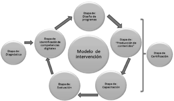 Un modelo de intervención se podría definir como un conjunto de elementos que tienen la finalidad de desarrollar competencias y habilidades (Dehesa et al., 2015: 72) que permiten al ciudadano apropiarse de las tic o de las nuevas tecno- logías, desde un plano básico, y que se requieren para su desarrollo intelectual y sociocultural (Area, 2002: 7).