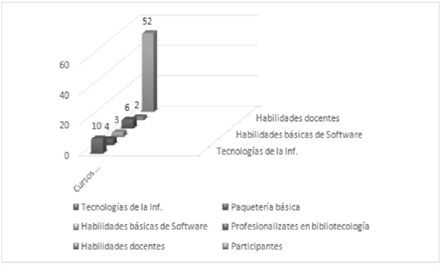 En el aspecto bibliotecario, se profesionalizaron en cursos cuya intención era el desarrollo de las habilidades propias de un bibliotecario del siglo XXI; en este caso se determinó que habría que enfatizar en las estrategias de búsqueda de información, en la micreoenseñanza, incluyendo aspectos que están inmersos en la publicación de material bibliohemerográfico (impreso o digital), ya fueran las licencias Creative Commons, o los derechos de autor; o bien la llamada iniciativa de Open Access que se presenta de manera muy particular en la producción de información académica y especializada, la cual forma parte de las bibliotecas.