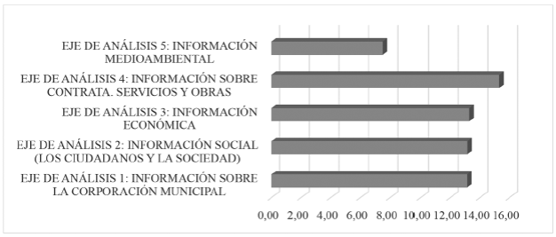 Del mismo modo, se han calculado los índices de divulgación por cada eje de análisis (Anexo 1) que recogen la aportación de cada eje al índice de divulgación total. En la Figura 6 se observa que el eje más divulgado es el eje de análisis correspondiente a información sobre contratación, servicios y obras (15.30 %), seguido del tercer y segundo eje de análisis, información económica (13.29 %) e información social (13.15 %).