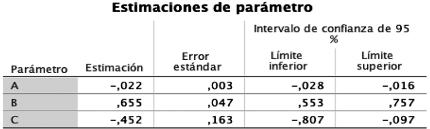 La regresión arrojó un coeficiente R2 de 0.8635 (Véliz, 2011). La Figura 3 muestra sus pruebas estadísticas. Para ambos coeficientes, los p-values son menores a 0.05, y los intervalos de confianza no pasan por 0.