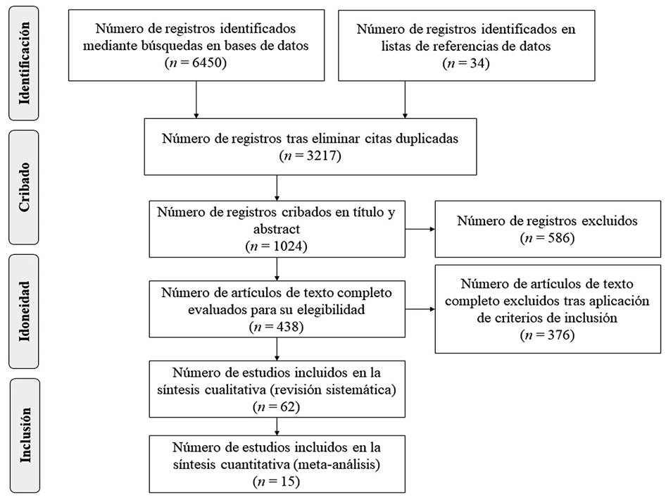 De este modo, quedó configurada la unidad de análisis en 48 documentos (WoS = 17; Scopus = 31) (1º ronda) a los que se añadieron posteriormente 14 más (WoS = 5; Scopus = 9) (2º ronda) en la revisión sistemática (N = 62). Para el metaanálisis finalmente se consideraron 15 documentos, aquellos que presentaban los datos estadísticos necesarios para su confección; se marcan en la lista de referencias con un asterisco (*). El refinado se estableció con base en los criterios de inclusión y exclusión (Tabla 1).