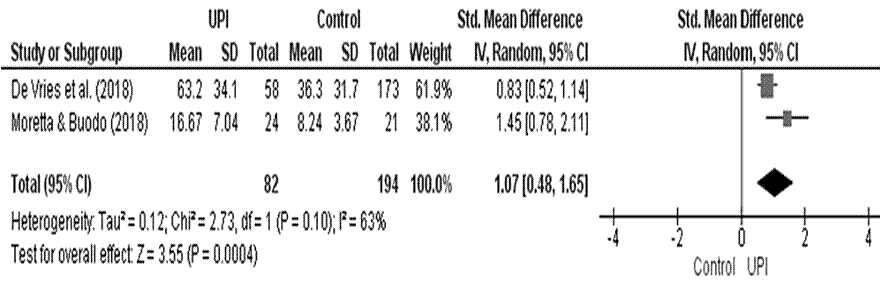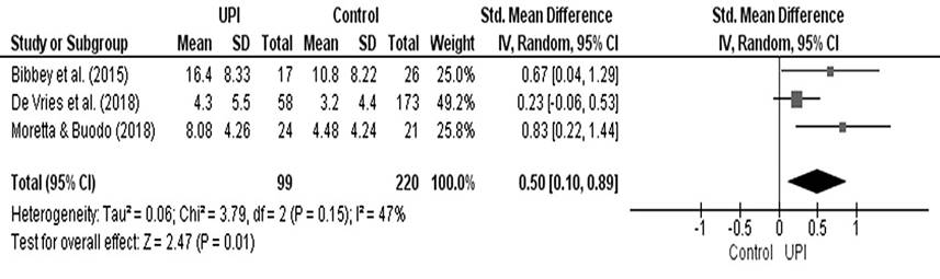 El metaanálisis recoge un total de tres estudios, dos con efecto a favor del grupo con UPI (Bibbey et al., 2015; Moretta y Buodo, 2018) y uno que roza la línea de no efecto (De Vries et al., 2018). No obstante, el tamaño del efecto es significativo a favor del grupo con UPI (p = .01) (Figura 4).