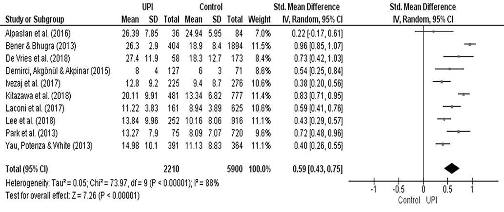 En relación al metaanálisis de las investigaciones, la mayor parte se sitúa a favor del grupo con UPI, únicamente Alpaslan et al. (2016) roza la línea de no efecto (Figura 5). Los datos establecen un tamaño del efecto significativo (p < .00001).