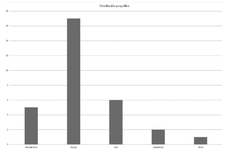 En cuanto a la distribución geográfica, la Figura 2 presenta que la gran mayoría de publicaciones que forma parte de nuestra muestra ha sido desarrollada en Europa con 54.8 % del total. Le sigue Asia con 19.35 % y Norteamérica con 16.12 %. Además, se presentan Sudamérica con 6.45 % y África con 3.22 % respectivamente. Esta distribución nos llama la atención, dado que, por el devenir histórico e ideológico de los países reflejados en la muestra, este tipo de investigaciones deberían tener mayor predominio en los países asiáticos o africanos -especialmente las acotadas en la categoría ‘Adoctrinamiento (ideológico-político-religioso)’-, donde logra observarse una influencia muy directa entre las cuestiones ideológicas y la educación. Sin embargo, no existe una relación directa entre la contextualización temática e ideológica con el número de publicaciones desarrolladas, planteándonos, también, como otro posible objeto de estudio a las dificultades para la producción de este tipo de trabajos en ciertos contextos, sirvan de ejemplos África y Asia.