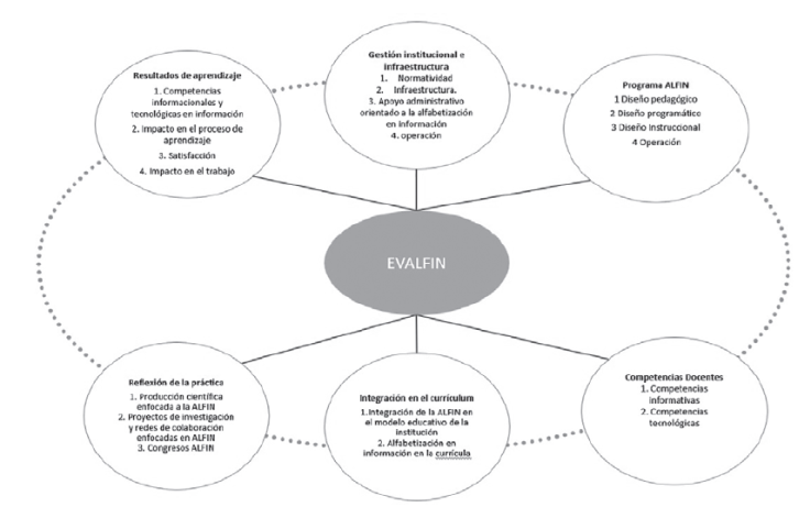 Los pocos esfuerzos realizados para su evaluación integral están disponibles como modelos. El primero es el propuesto por Lindauer (2006: 71), el cual es un modelo teórico que propone tres ámbitos: el entorno de aprendizaje, los componentes del programa y los resultados del aprendizaje del alumno. El segundo modelo denominado Alfinev, que fue propuesto por Meneses-Placeres (2010: 97) y aplicado en una sola institución, se integra de tres componentes: profesionales de la información, recursos y alumnos. Este busca “representar el proceso de evaluación de la alfabetización informacional en la educación superior de manera que permita la comprensión integral del fenómeno” (95) y visibilizar la complejidad de la evaluación y la interacción de sus componentes.