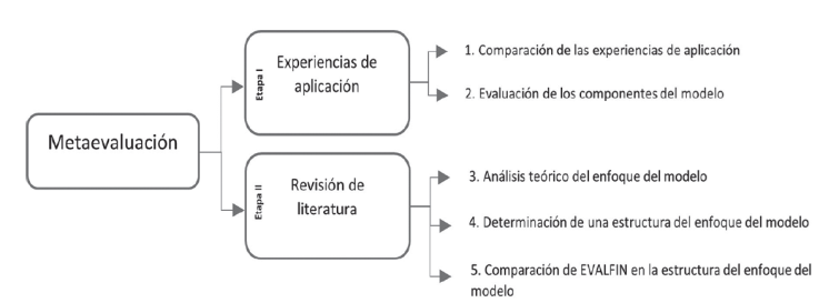 Para desarrollar la evaluación del modelo Evalfin, la investigación se vale de la metaevaluación, que implica una “investigación sistemática cuyo objetivo es emitir un juicio acerca de la calidad, la relevancia, la pertinencia o los méritos de una evaluación” (Elizalde Lora, Pérez López y Olvera Larios, 2008: 115). El procedimiento de metaevaluación propuesto comprende de cinco fases divididas en dos etapas (Figura 2). La primera analiza las experiencias de aplicación del modelo comparando los escenarios, y evalúa sus componentes para determinar su utilidad y problemáticas. La segunda examina los fundamentos teóricos del modelo y los compara con la literatura para determinar el enfoque de evaluación, e indaga en la relación e interacción de los componentes de Evalfin utilizando como fondo una estructura basada en el enfoque del modelo.