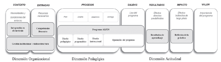Para la fase de salidas no se diseñó un componente específico. En la fase resultados, se tiene el componente de resultados del aprendizaje que considera las competencias ganadas y la satisfacción que los participantes obtienen por la entrega del programa. En la fase impacto se encuentra el componente reflexión de la práctica en el cual se valora la toma de conciencia sobre la intervención del programa de alfabetización informacional y sus consecuencias. Para la fase valor no hubo ningún componente (Figura 4).